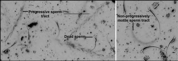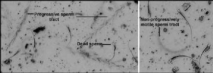 Evaluating the Rottweiler Stud While the vast majority of fertility problems do surround the bitch, careful evaluation of the semen quality of the male is necessary to rule out male infertility. In evaluating motility with most species, sperm are classified as non-motile, progressively motile or non-progressively motile. A progressively motile sperm swims forward in an essentially straight line, whereas a non-progressively motile sperm swims, but with an abnormal path, such as in tight circles. There is considerable variability among species in what is considered normal or acceptable motility. For example, to pass a breeding soundness examination, it is recommended that bulls have greater than 30% progressively motile sperm, stallions greater than 60% and dogs greater than 70%. Example Rottweiler stud semen motility evaluation Micro Video. Techniques for Evaluation of Sperm MotilityThere are several means for evaluating motility. Which technique to use depends on experience of the operator, the desire for precision and repeatability, and availability of equipment. In almost all cases, motility is reported as the percentage of sperm that manifest motility (usually progressive motility). Manual motility estimates (wet mount): This commonly-used technique involves placing a sample of diluted semen on a microscope slide, examining it with a microscope and estimating the fraction of the population that is motile. More specifically, a sample of semen is diluted in warm extender or buffered saline, and about 10 to 20 microliters of this sample is pipetted onto a clean, prewarmed microscope slide. A coverslip is lowered onto the sample, avoiding formation of air bubbles if possible, and the slide is examined using a microscope with a 20X objective. At least ten widely-spaced fields are examined to provide an estimate of the percentage of motile cells. If estimating motility is a commonly required technique, a microscope warm stage may be worth purchasing. A bright field microscope can be used for evaluating motility if the field diaphragm is closed to enhance contrast and ability to visualize sperm. A much better choice is a phase contrast microscope or a microscope equipped for differential interference contrast (DIC). Examine the images above to appreciate the difference in these three types of microscopy - clearly, unstained sperm are difficult to observe using bright field. Manual motility estimates are easy to perform and require minimal equipment. In the hands of an experienced evaluator, manual estimates generally provide good estimates of motility. The chief limitation of this technique is its subjective nature. Samples with outstanding motility tend to be scored lower than they should be ("it can't be that good ..") and poor samples tend to be scored higher than they should ("it can't be that bad .."). Track motility estimates: A wet mount of diluted semen is prepared as described for a manual estimate, and sperm are photographed using an exposure time long enough for motile sperm to leave tracks across the image (roughly 0.2 seconds). Using this technique, non-motile sperm appear .. well .. non-motile, and sperm with non-progressive motility leave tracks that are circular or otherwise abnormal. If a digital camera is used, the image can be displayed on a computer monitor for convenient tabulation. The images below depict the track motility technique. On the left, three progressively motile sperm are represented by three straight tracks. On the left, a circular track is seen, representing a non-progressively motile sperm. Non-motile sperm are seen in both images. Track motility estimates require more time to perform that manual estimates, but they are objective and repeatable. Additionally, one can save the images for a permanent record. The articles and links provided here will provide you with all the knowledge necessary to fully understand a bitches estrus cycle. VKW Rottweilers offers complete cytology, progesterone, and LH testing. (St. Louis area only)